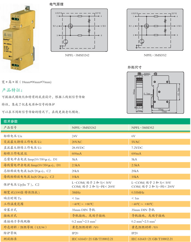 NPFL-3MSD52,NPFL-3MSD242,三線制通用型信號(hào)浪涌保護(hù)器(浮地)