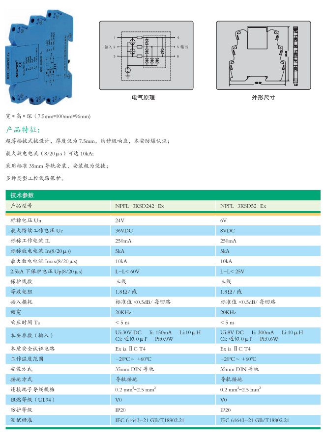 NPFL-3KSD52-Ex,NPFL-3KSD242-Ex,三線制本安型信號(hào)浪涌保護(hù)器(浮地)