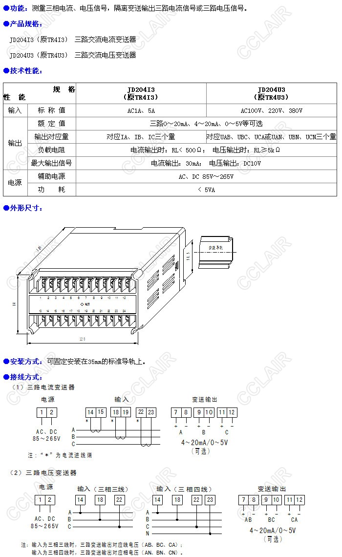 JD204I3,JD204U3,三路電流/電壓變送器