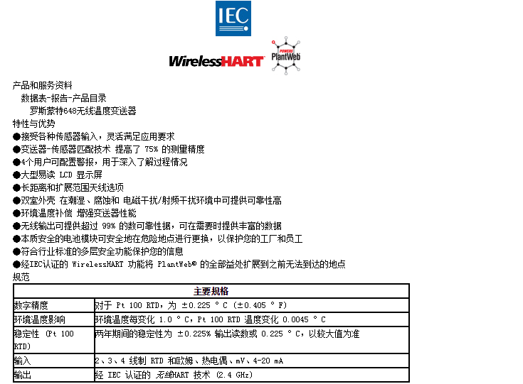 羅斯蒙特 648 無線溫度變送器包括一個(gè)大型易讀顯示屏、用戶可配置的過程警報(bào)、長距離和擴(kuò)展范圍天線選項(xiàng)以及用于增強(qiáng)準(zhǔn)確性的變送器-傳感器匹配技術(shù)。 648 無線溫度變送器完全兼容經(jīng) IEC 認(rèn)證的 WirelessHART 網(wǎng)絡(luò),是一項(xiàng)可提供豐富診斷數(shù)據(jù)和可靠性能的智能無線溫度解決方案。