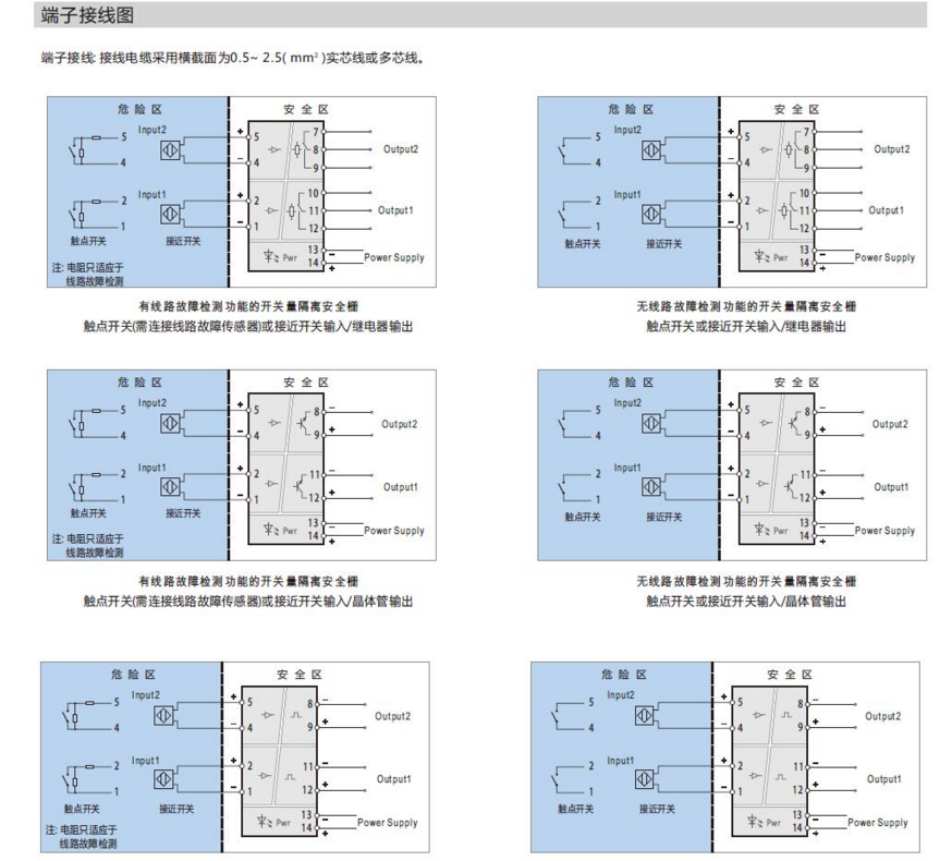 (說明: 當(dāng)用到線路檢測功能時(shí),如果需要使用機(jī)械觸點(diǎn)開關(guān)作為輸入設(shè)備,必須在輸入回路中連接線路故障傳感器,以避免開關(guān)量隔離安全柵將機(jī)械觸點(diǎn)開關(guān)正常的通斷誤當(dāng)做輸入回路的斷路或短路故障。)