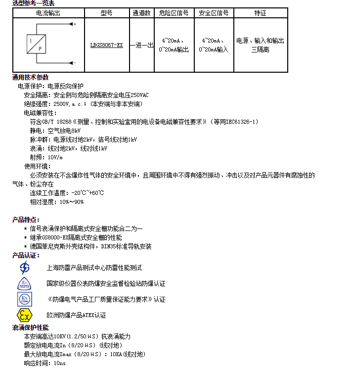 LBGS8067-EX,電流輸出浪涌保護(hù)隔離柵