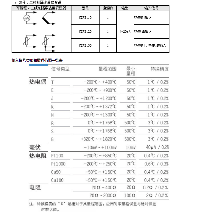 ※ 用于來自熱電阻、電阻式傳感器, 熱電偶或電壓傳感器的信號輸入,經過隔離變送輸出標準的直流電流信號4~20mA。