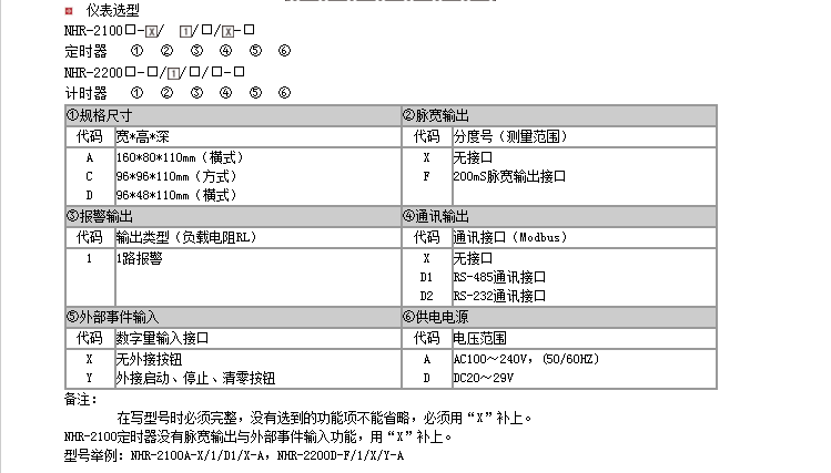 概述 NHR-2100/2200系列定時器/計時器采用全自動貼片封裝工藝,具有很強(qiáng)的抗干擾能力,并具有多種輸出功能和控制功能,廣泛運(yùn)用于電力、石化、冶金、輕工、制藥、航空等諸多領(lǐng)域。 6位LED數(shù)碼顯示,顯示范圍寬,并且顯示亮度可以調(diào)整。 具備遞增和遞減兩種計時方式。 具備“定時報警”、“計時報警”功能,帶LED報警燈指示;計時報警時,可選200mS脈寬同步輸出,同時儀表將自動清零且停止報警,并重新開始計時。 支持RS485、RS232串行接口,采用標(biāo)準(zhǔn)MODBUS RTU通訊協(xié)議。 具備儀表按鍵啟動、停止、清零功能操作,也可外接啟動、停止、清零功能按鈕。 輸出、電源、通訊相互之間采用光電隔離技術(shù)。 具備多種外形尺寸及樣式供用戶選擇。 面板輕觸式按鍵設(shè)置,參數(shù)設(shè)置斷電永久保存。