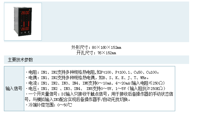 WP-KS805系列雙回路串級(jí)智能PID調(diào)節(jié)控制儀,具有5個(gè)模擬輸入(IN1-IN5)2個(gè)模擬輸出(OUT1、OUT2),一個(gè)開關(guān)量輸入DI,2個(gè)開關(guān)量輸出和豐富的控制算法,適用于鍋爐汽包水位三沖量控制或兩沖量控制并可帶汽包水位壓力補(bǔ)償功能適用于一般工業(yè)過(guò)程中溫度、壓力、液位、流量等各種過(guò)程參數(shù)的串級(jí)控制,前饋控制、雙路控制等,并可帶后備操作器,與后備控制器配套實(shí)現(xiàn)手動(dòng)/自動(dòng)無(wú)擾切換。