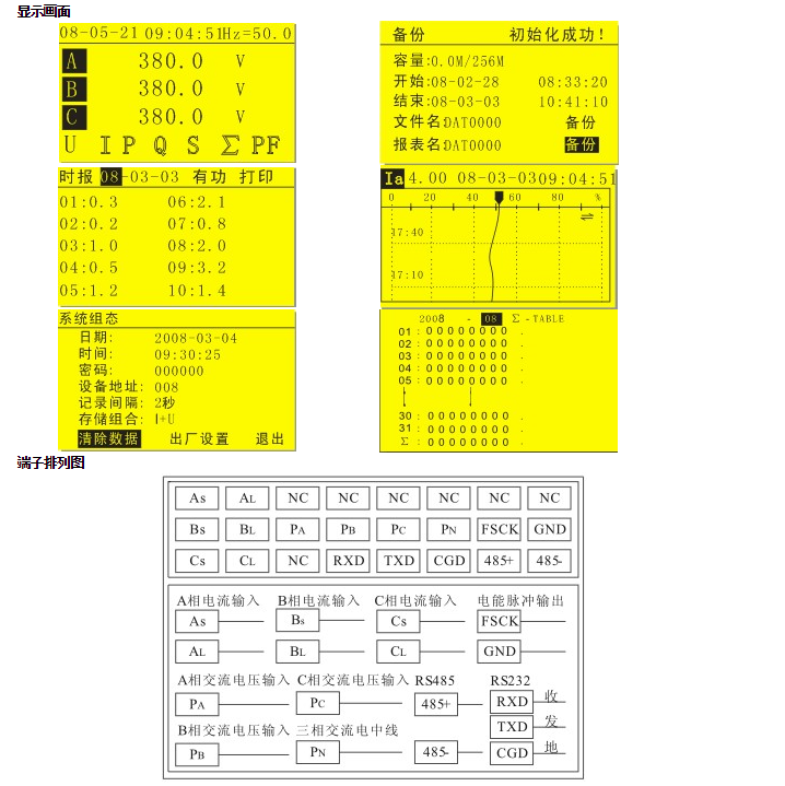 顯示三相電流、三相電壓、三相有功功率、三相無功功率、三相視在功率、功率因素、頻率、累積電能等電量參數(shù)。
