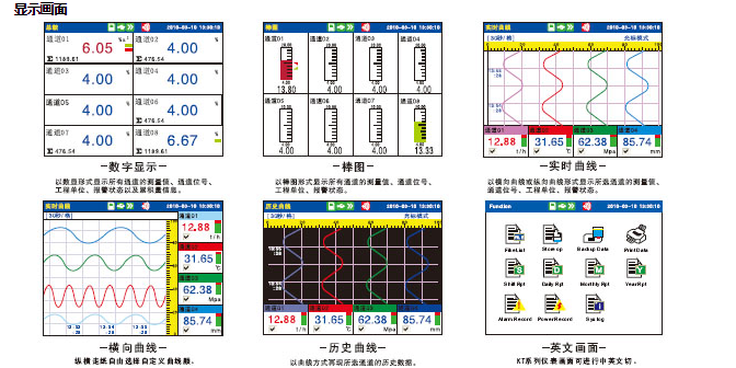 測量數據顯示(總覽、數宇顯示、V圖顯示、曲錢顯示〗,歷史曲線顯示,信息顯示(報替信息、累積報表),功能畫面(數據備份、打印)