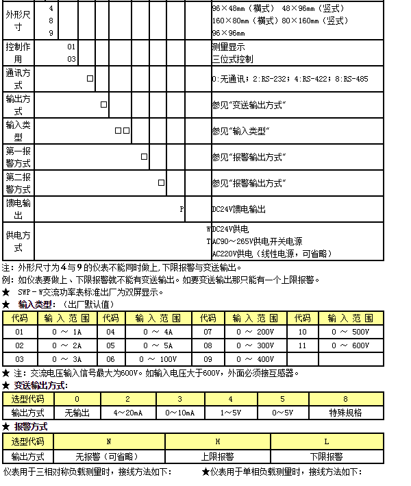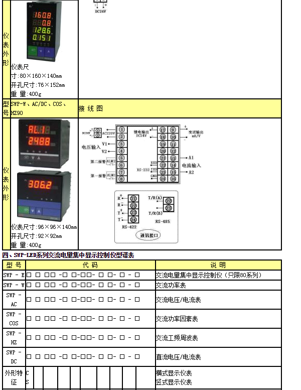 SWP-LED系列交流電量集中測(cè)量顯示控制儀用于測(cè)量采樣電壓和電流互感器信號(hào),測(cè)量頻率,電壓和電流以及功率因數(shù)和單相有功功率P有=U·I·CosΦ或三相有功功率P有= ![]()