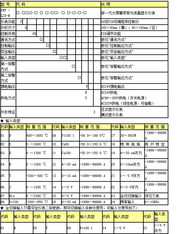 | 1、用戶依照儀表LCD顯示屏中文菜單提示,通過(guò)面板按鍵可完成輸入信號(hào)類型與分度號(hào)的自由切換,實(shí)現(xiàn)萬(wàn)能輸入 |