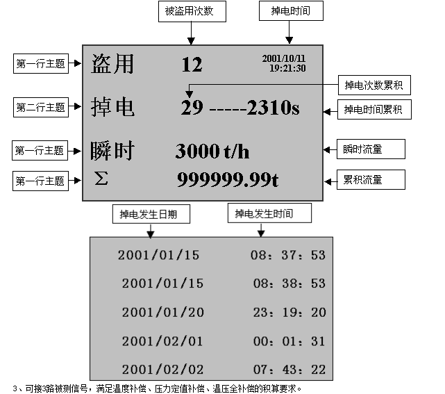 (1)可記錄儀表工作期間發(fā)生掉電的時(shí)間、次數(shù)及掉電時(shí)間累積值,防止人為或意外掉電造成流量偏差
