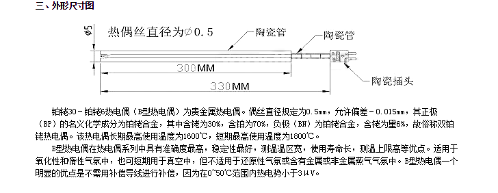 特點:具有耐高溫,測量精度高,如果保護管用上陶瓷管和氧化鋯管做雙層保護壽命會更長。