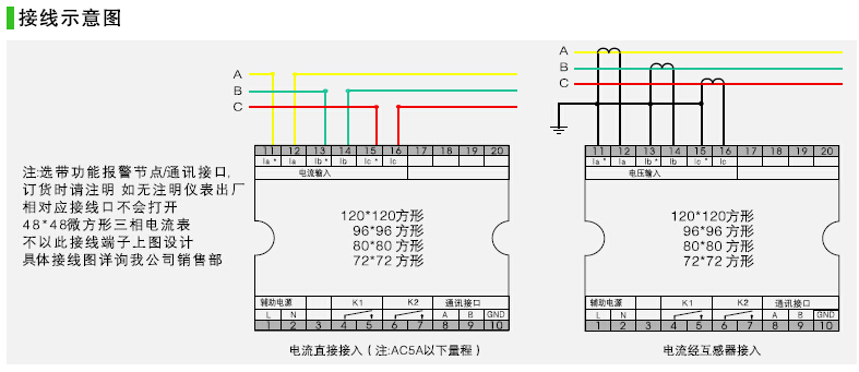 一、數(shù)字三相電流表 產(chǎn)品概述 外形尺寸120X120mm 開孔尺寸111X111mm
