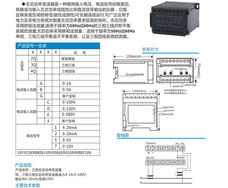 無功功率變送器輸出范圍:DC4-20mA、0-20mA、0-5V、0-10V、1-5V等用戶需要的標準信號