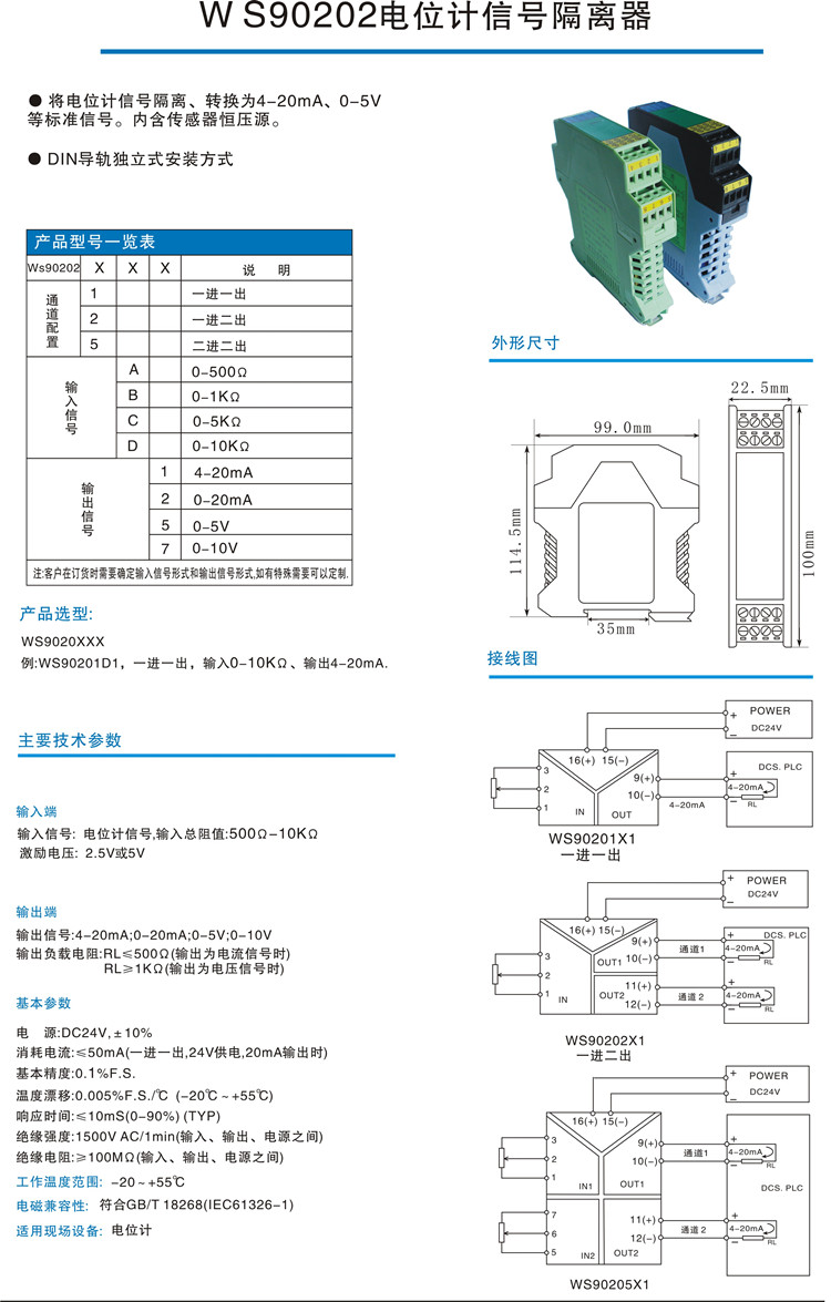 WS90202電位計變送器 電位計信號隔離器技術(shù)參數(shù)詳細(xì)介紹