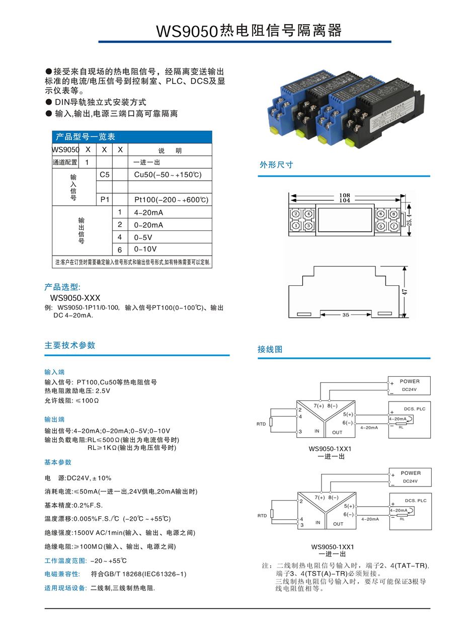 WS9050熱電阻信號調(diào)理器,接受來自現(xiàn)場的熱電阻信號,經(jīng)隔離變送輸出標準的電流/電壓信號到控制室、PLC、DCS及顯示儀表等,輸入、輸出、電源三端口隔離,DINT型導(dǎo)軌安裝