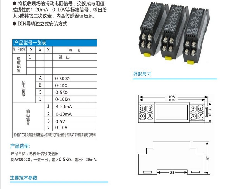 WS9020電位計變送器 電位計隔離器技術參數(shù)詳細介紹: