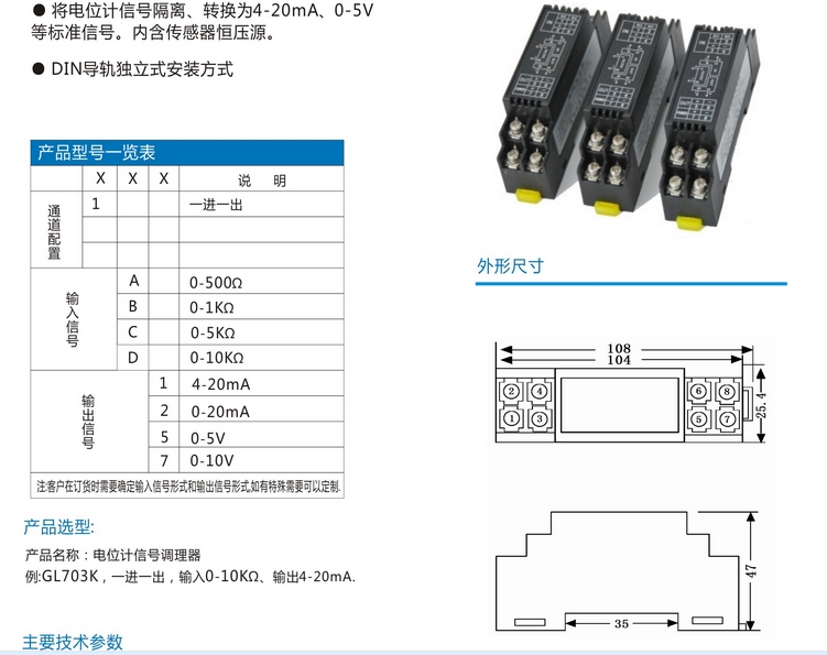 GL703K信號(hào)隔離調(diào)理器輸入范圍:0-500Ω 0-1KΩ、0-10KΩ、0-20KΩ等用戶特定規(guī)格