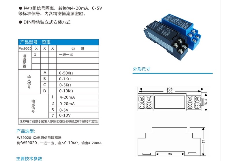 WS9020-1A2,WS9020,電阻信號(hào)隔離器。