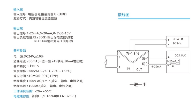 電阻信號(hào)隔離器、變送器輸出范圍:0-20mA、4-20mA、0-5V、0-10V、1-5V等用戶需要的標(biāo)準(zhǔn)信號(hào)
