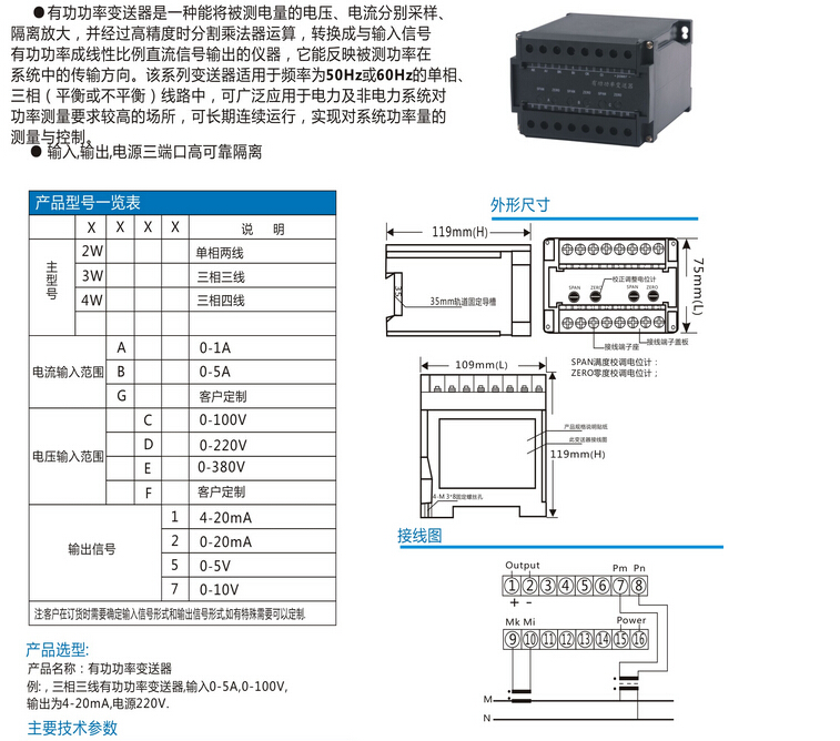 有功功率變送器輸出范圍:DC4-20mA、0-20mA、0-5V、0-10V、1-5V等用戶需要的標(biāo)準信號