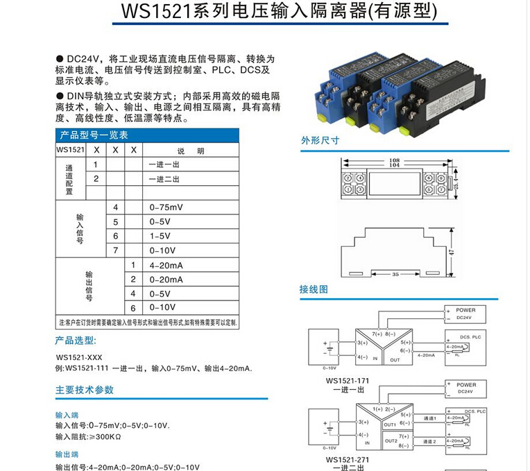 WS1521信號(hào)轉(zhuǎn)換模塊 輸入范圍:模擬量信號(hào) DC4-20mA、0-20mA、0-10V、0-5V等
