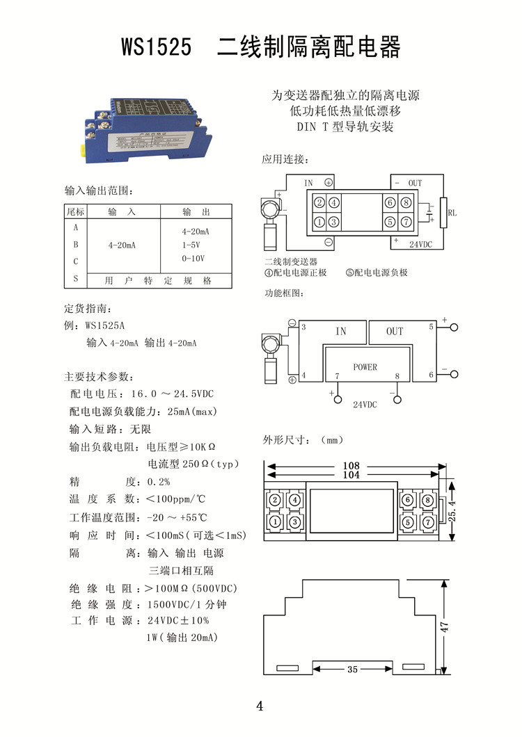 WS1525信號隔離器 二線制電流變送器,直流電流變送器,為變送器配獨(dú)立的隔離電源,低功耗、低熱量、低漂移,DIN T型導(dǎo)軌安裝
