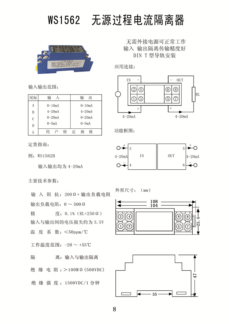 WS1562信號(hào)隔離器,無(wú)源過(guò)程電流信號(hào)隔離器4-20mA 0-20mA無(wú)需外接電源,輸入輸出隔離傳輸精度高,DIN T型導(dǎo)軌安裝