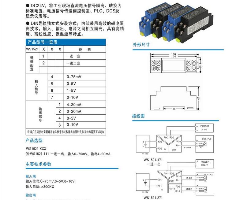 WS1521信號隔離器,三端口直流電壓隔離變送器,信號隔離端子。輸入、輸出、電源三端口隔離,高低電壓、高低信號多種直流信號輸入,DIN T型導(dǎo)軌安裝