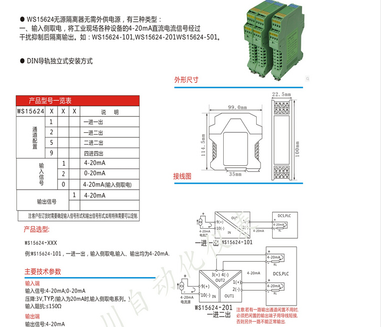 WS15624四輸出全隔離信號隔離器,將輸入的四路信號隔離輸出,無需外接電源可正常工作,輸入輸出隔離,傳輸精度高,標(biāo)準(zhǔn)DIN T型導(dǎo)軌安裝