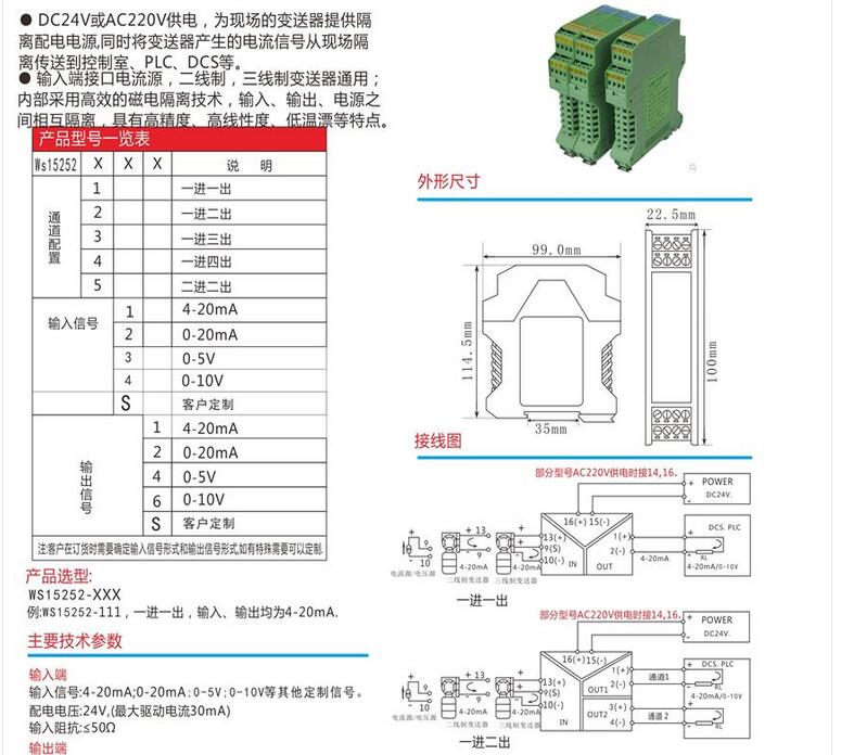 WS15252信號隔離器,全隔離雙輸出信號分配器,轉(zhuǎn)換模塊,mv、V、mA將輸入信號變換為兩路相互隔離的信號,低功耗,低熱量,低漂移,DIN T型導(dǎo)軌安裝