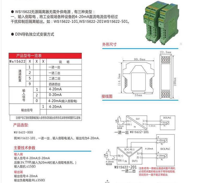 WS15622無源過程信號隔離器,全隔離信號隔離器,將輸入的四路信號隔離輸出,無需外接電源可正常工作,輸入輸出隔離,傳輸精度高,標準DIN T型導軌安裝