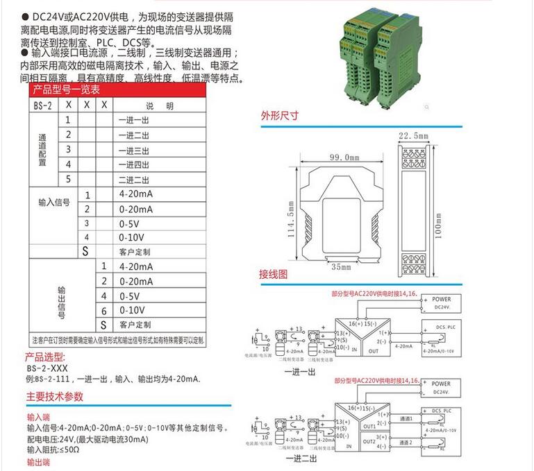 BS-2全隔離信號調(diào)理模塊,全隔離輸出信號分配器 安全隔離柵,信號隔離器模塊,安全柵,電流轉(zhuǎn)換模塊。將輸入信號變換為兩路相互隔離的信號,低功耗,低熱量,低漂移,DIN T型導(dǎo)軌安裝