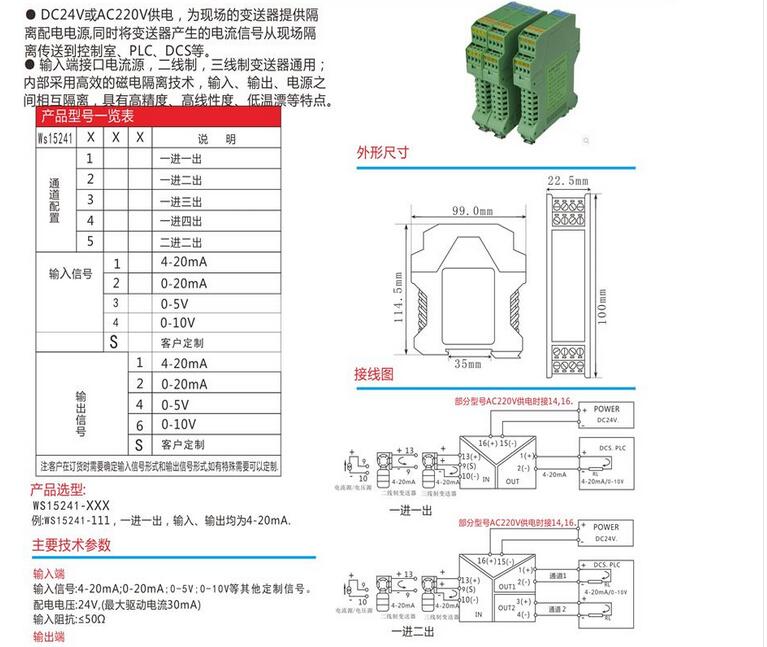 WS15241隔離柵,信號(hào)隔離器,全隔離輸出信號(hào)分配器 隔離柵,信號(hào)隔離器模塊,安全柵,電流轉(zhuǎn)換模塊。將輸入信號(hào)變換為兩路相互隔離的信號(hào),低功耗,低熱量,低漂移,DIN T型導(dǎo)軌安裝
