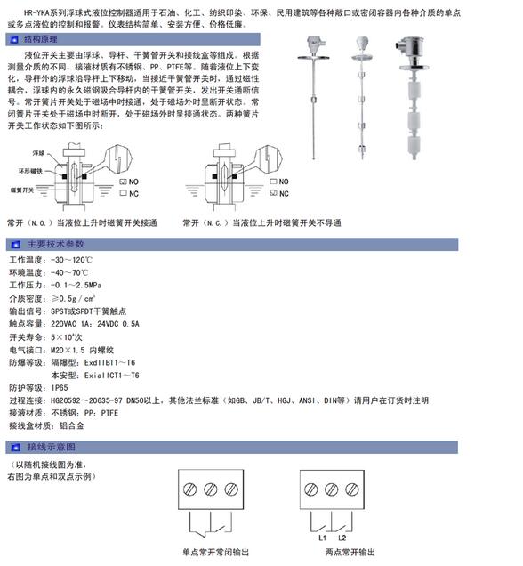 HR-YKA系列浮球式液位控制器適用于石油、化工、紡織印染、環(huán)保、民用建筑等各種敞口或密閉容器內(nèi)各種介質(zhì)的單點或多點液位的控制和報警。儀表結(jié)構(gòu)簡單、安裝方便、價格低廉。
