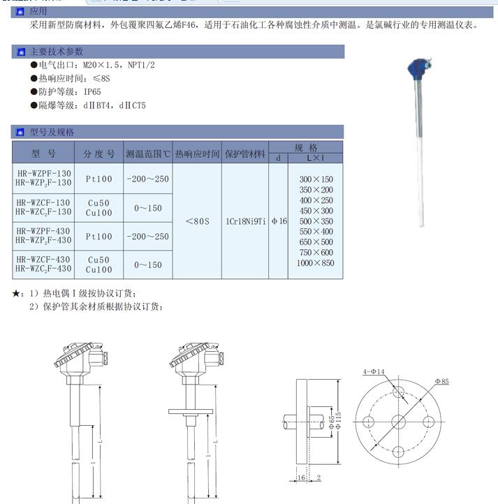 采用新型防腐材料,外包覆聚四氟乙烯F46,適用于石油化工各種腐蝕性介質(zhì)中測(cè)溫。是氯堿行業(yè)的專用測(cè)溫儀表
