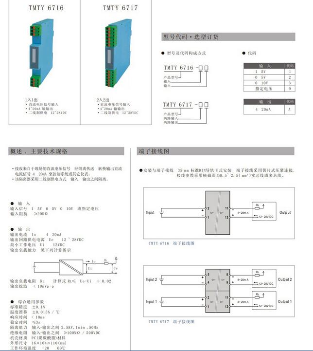 直流電壓輸入,兩線制隔離器. TMTY6716 1入1出; TMTY6717 2入2出