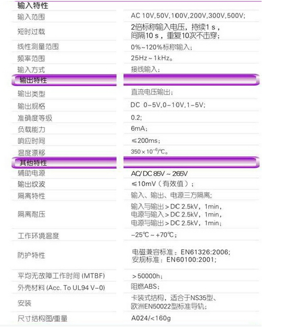 產(chǎn)品型號:WBV412H29 輸入規(guī)格:AC 10V~500V范圍可選 輸出規(guī)格:DC 5V,10V,1-5V 輔助電源:AC/DC 85V~265V 孔徑大小: 安裝方式:導(dǎo)軌安裝