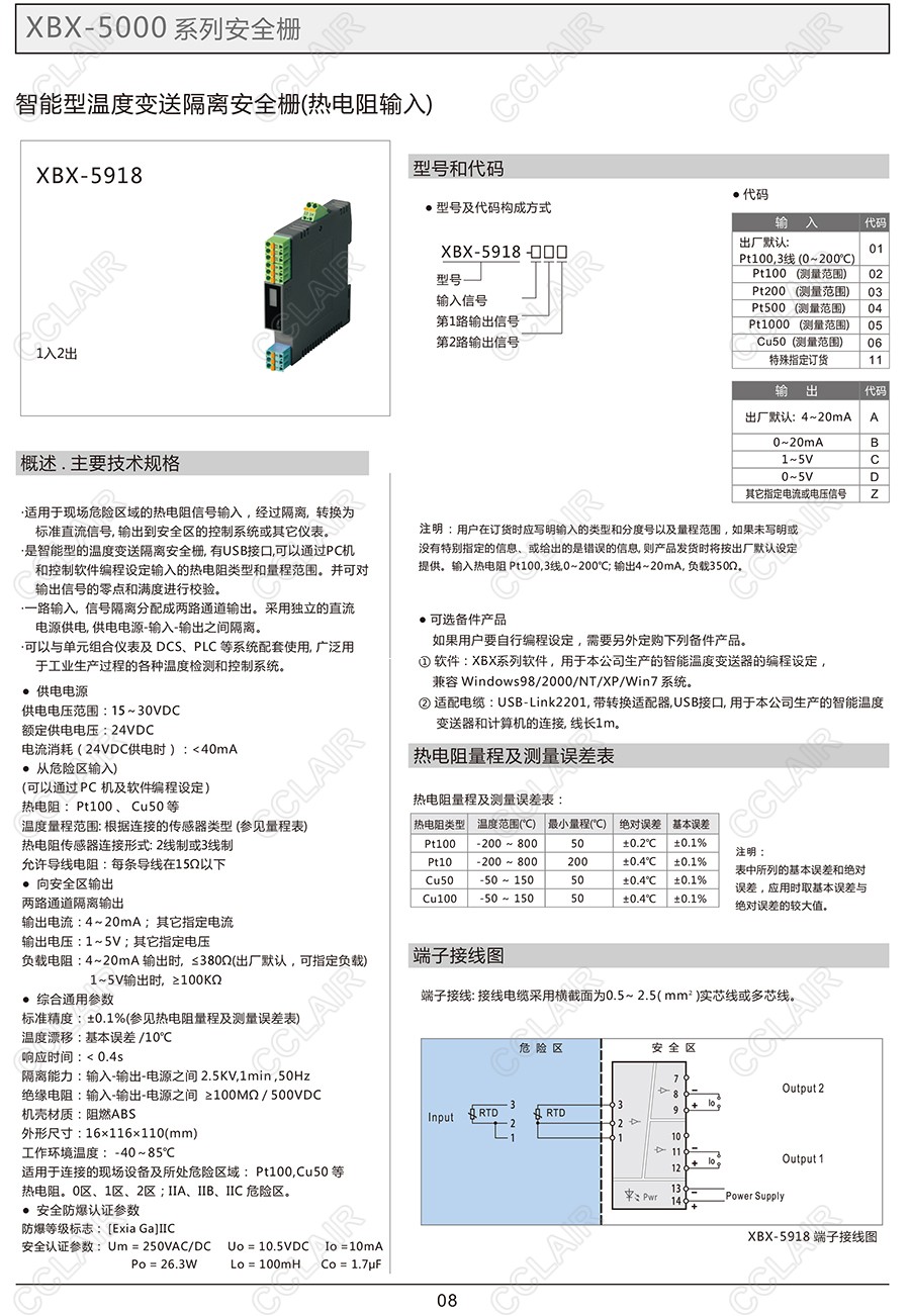 XBX-5918,XCX-5918-02C,XCX-5918-03C,XCX-5918-04C,智能型溫度變送器隔離安全柵(熱電阻輸入)(一入二出)