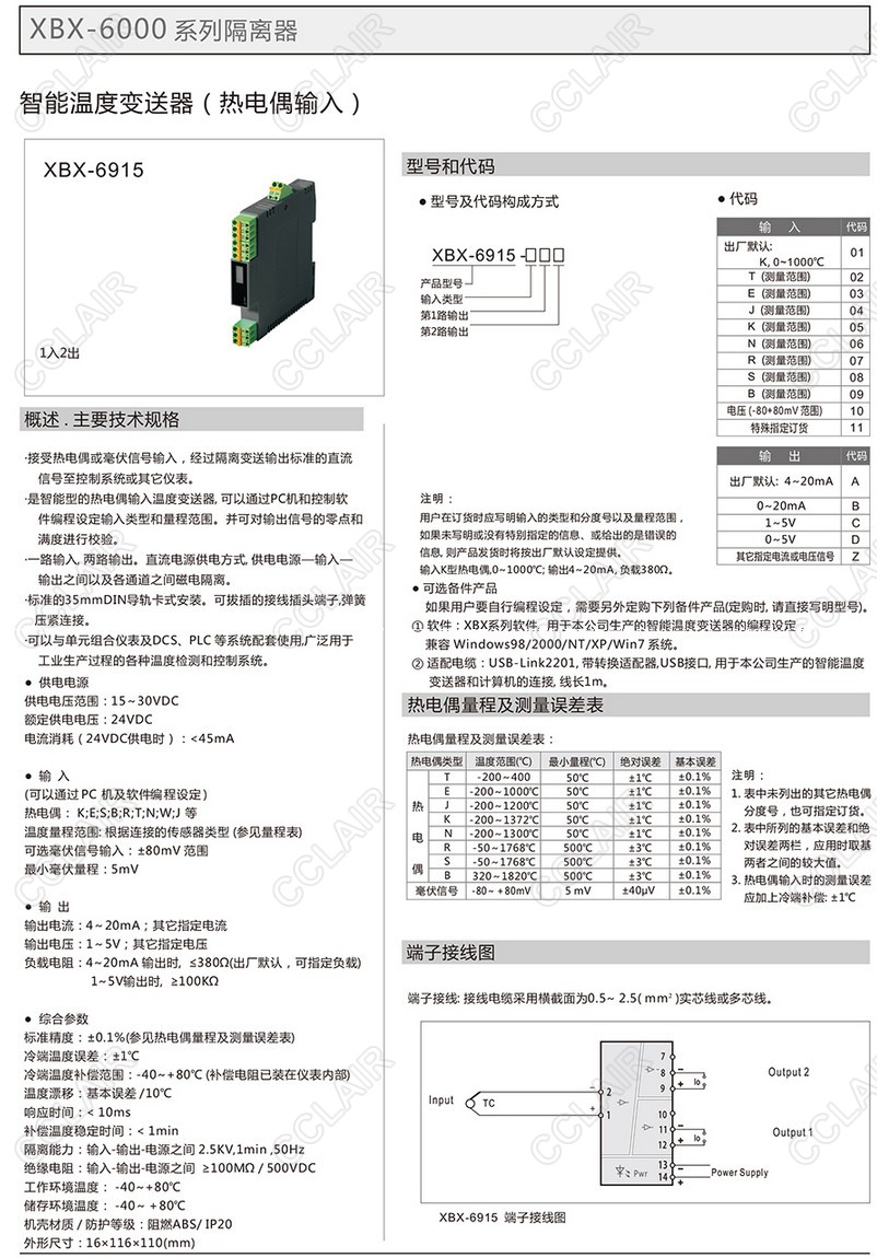 XBX-6915,XBX-6915-01A,,XBX-6915-02A,智能溫度變送器(熱電偶輸入)(一入二出)