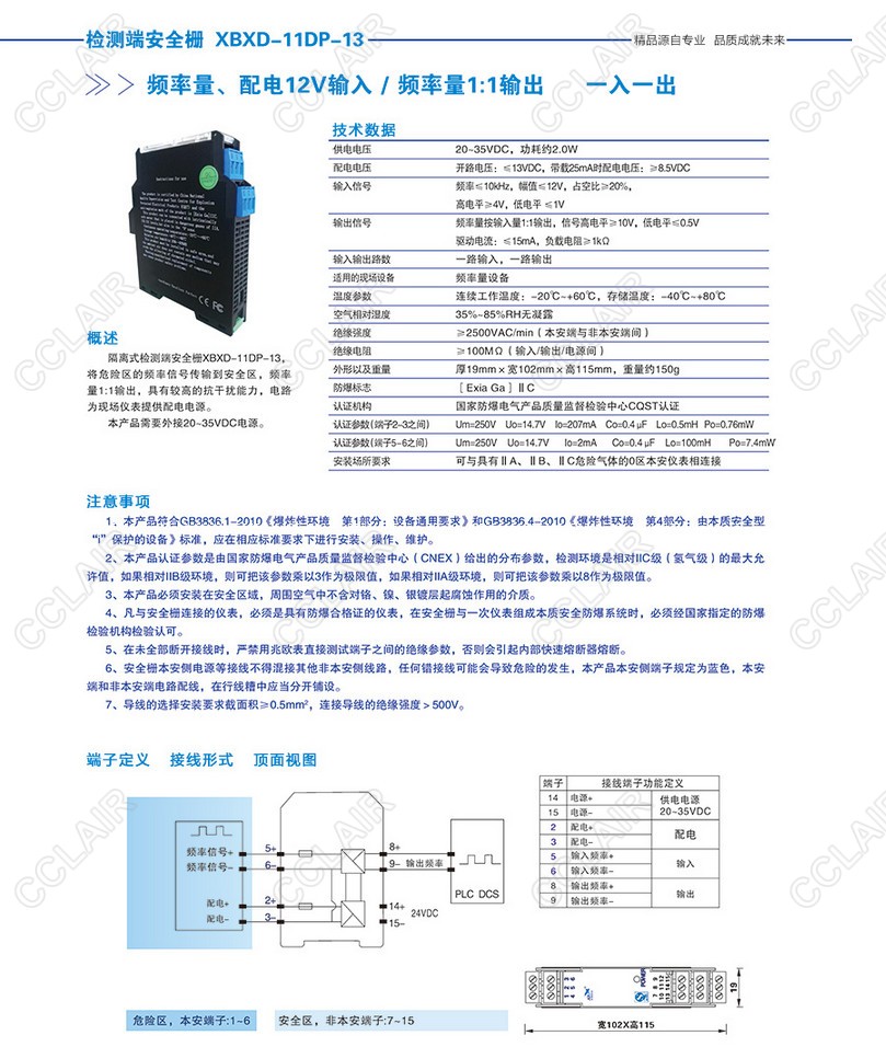 XBXD-11DP-13檢測(cè)端安全柵 配電12V頻率量輸入,1:1輸出(一入一出)