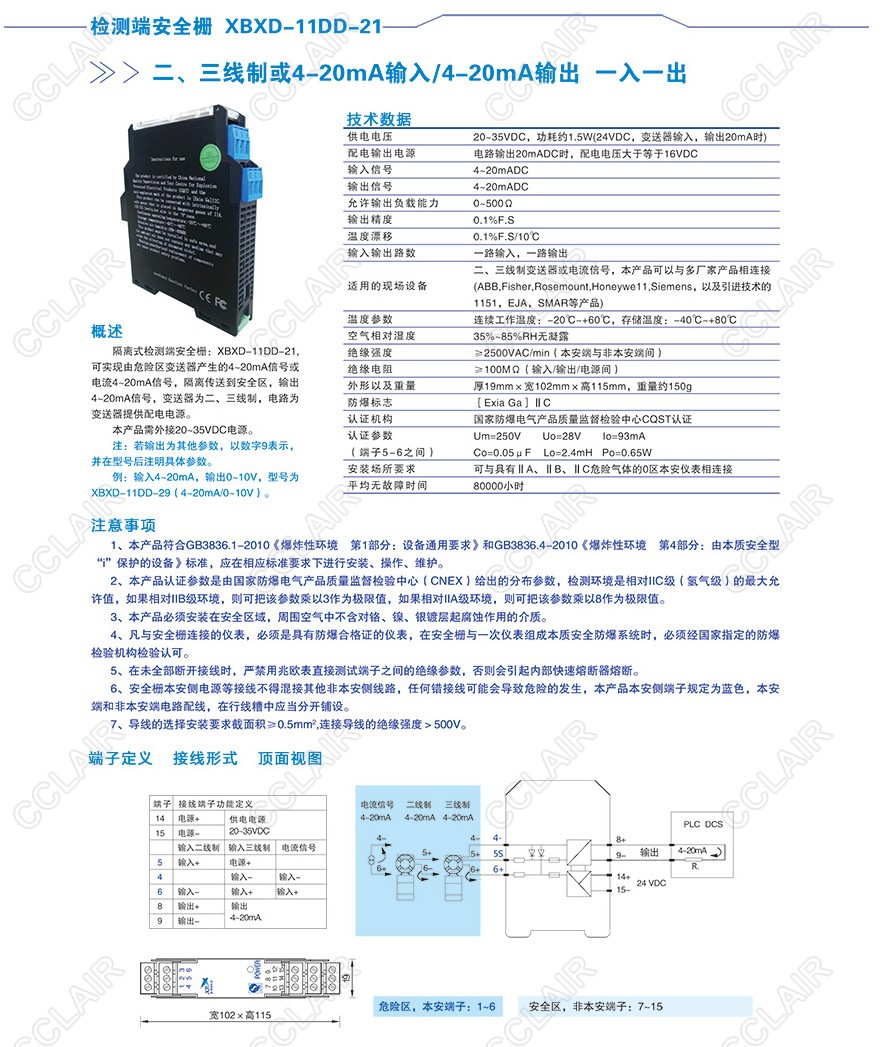 XBXD-11DD-21,XBXD-11DD-29檢測(cè)安全柵二、三線制或直流4-20mA輸入,4-20mA輸出(一入一出)