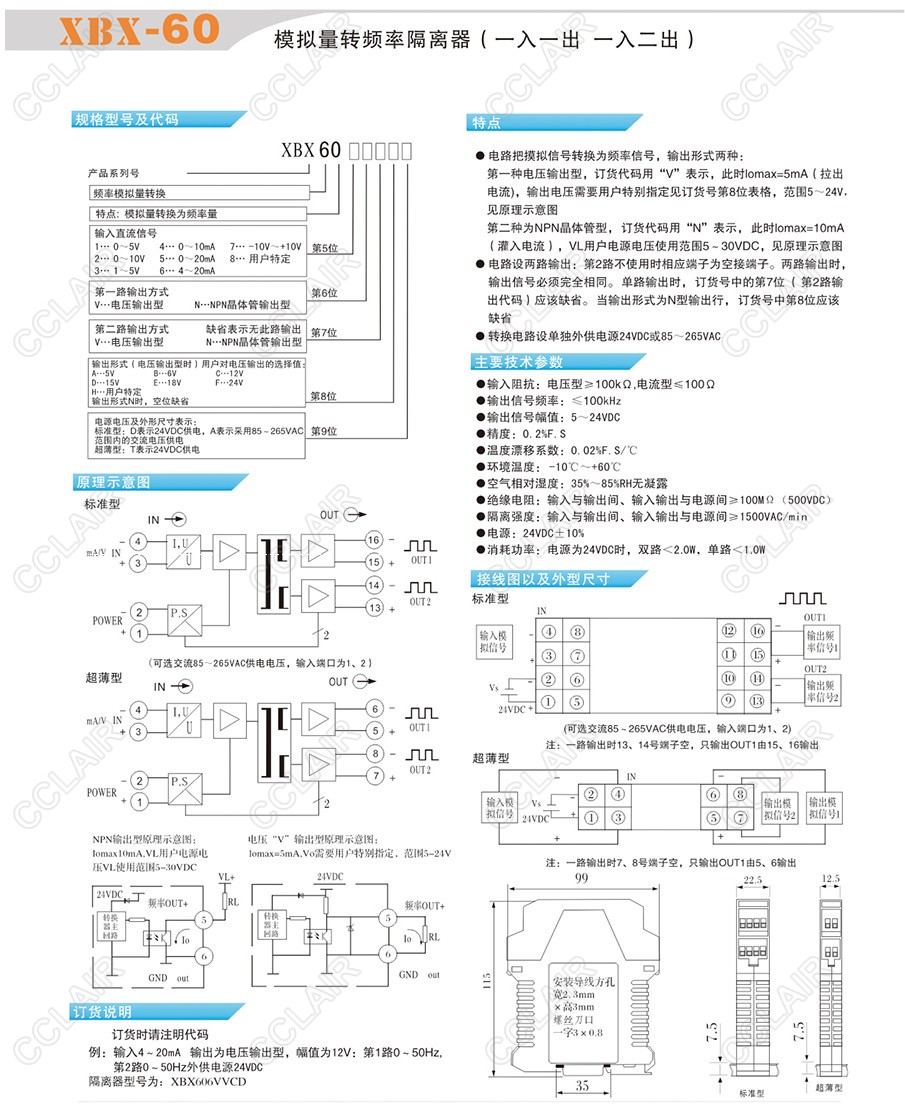 XBX-60-5VVAA,XBX-60-6VVAA,XBX-60-7VVAA,XBX-60-8VVAA,模擬量轉(zhuǎn)頻率隔離器(一入一出 一入二出)