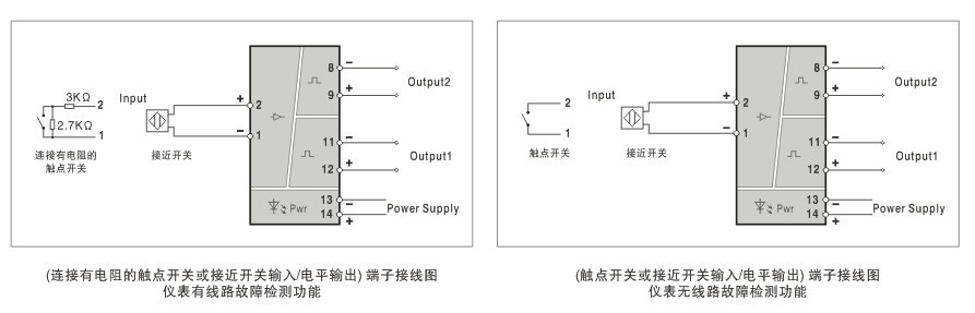 本儀表出廠設(shè)定為: 當(dāng)檢測(cè)到輸入線路故障時(shí), 儀表面板上的故障檢測(cè)指示燈亮,輸出繼電器觸點(diǎn)為松開(kāi)狀態(tài) ( 如果是晶體管輸出,則晶體管不導(dǎo)通; 如果是電平信號(hào)輸出, 則輸出為低電平信號(hào))。