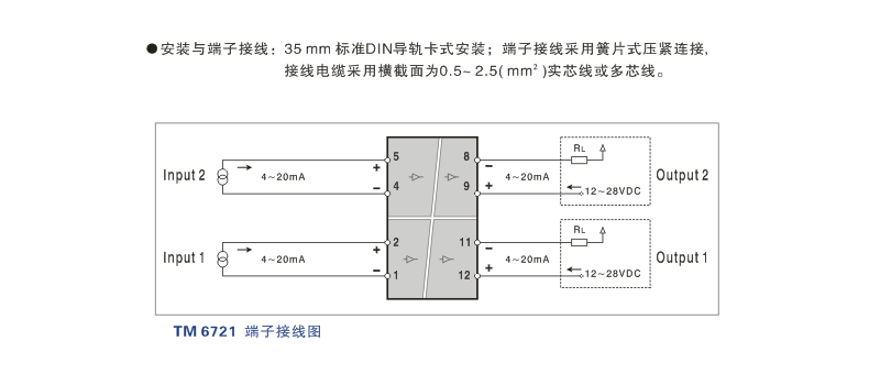 TM6721 直流電流輸入二線制隔離器 端子接線圖