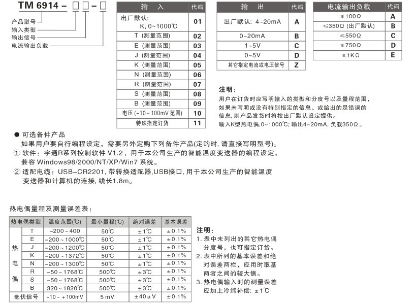 是智能型的溫度變送器, 有 USB 編程接口, 可以使用專用的編程電纜連接這個(gè)溫度變送器和PC機(jī), 通過軟件在PC機(jī)上進(jìn)行編程, 可以任意編程設(shè)定熱電偶分度號和測量溫度的量程范圍。