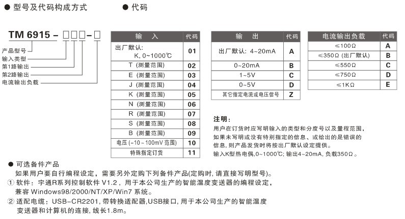 是智能型的溫度變送器, 有 USB 編程接口, 可以使用專用的編程電纜連接這個(gè)溫度變送器和PC機(jī), 通過軟件在 PC 機(jī)上進(jìn)行編程,可以任意編程設(shè)定熱電偶分度號(hào)和測(cè)量溫度的量程范圍。