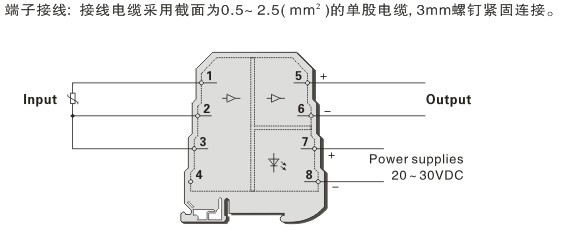 單通道,一入一出。 Pt100,Cu50 等熱電阻輸入。 直流電源供電方式,帶有工作電源指示燈。 輸入-輸出-電源之間隔離。 小體積, 超薄, 殼體厚度僅為6.2 mm。 端子化設計, 全蔽結構, 無需防塵。 螺絲擰緊連接, 接線簡單。 概述 用于Pt100,Cu50 等熱電阻輸入, 經(jīng)隔離變送輸出標準的直流電流或電壓信號。 采用獨立的直流電源供電,供電電源 - 輸入 - 輸出之間隔離。 該隔離器體積小, 超薄, 機殼厚度僅為6.2mm。屏蔽的端子化結構設計,結構緊湊, 無需防塵,無需散熱。 標準的 35mmDIN 導軌卡式安裝。 該溫度隔離變送器可以與單元組合儀表及 DCS、PLC 等系統(tǒng)配套使用,廣泛用于工業(yè)生產過程的各種溫度檢測。 技術參數(shù) 輸 入 輸入熱電阻: Pt100;Pt10;Cu50;Cu100等各型熱電阻 允許導線電阻:每條導線≤10Ω 輸 出 輸出電流:4~20mA;0~20mA;0~10mA;其它指定電流 輸出電壓:1~5V;0~5V;0~10V;其它指定電壓 電流輸出負載:4(0)~20mA輸出時, ≤350Ω(出廠默認), 另有 ≤100Ω, ≤550Ω,≤750Ω,≤1KΩ 可選 電壓輸出負載:1(0)~5V輸出時, ≥10KΩ 輸出紋波: < 10mVp-p 綜合通用參數(shù) 供電電壓范圍:20~30VDC 額定供電電壓:24VDC 電流消耗 (24VDC供電時):< 30mA 標準精度:±0.1% (參見熱電阻類型、量程及測量誤差表) 溫度漂移:基本誤差 /10℃ 響應時間:< 10ms 穩(wěn)定時間:< 3s 隔離能力:輸入-輸出-電源之間 2.5KV,1min ,50Hz 絕緣電阻:輸入-輸出-電源之間 ≥100MΩ / 500VDC 工作環(huán)境溫度:-20~+60℃ 儲存環(huán)境溫度:-40~+80℃ 環(huán)境濕度范圍: 5~95%(無冷疑) 電磁兼容:符合 89 / 336 / EEC , IEC/EN 61000 機殼材質:PC(聚碳酸脂)材料 防護等級:IP 20 外形尺寸:6.2×84×100(mm) 重量: 約 50 克 選型、訂貨代碼 ![]() 端子接線圖