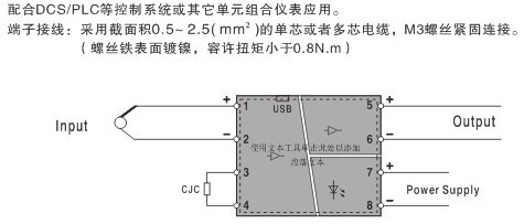 熱電偶或毫伏信號輸入,經(jīng)過隔離變送輸出標(biāo)準(zhǔn)的直流信號至控制系統(tǒng)或其它單元組合儀表。