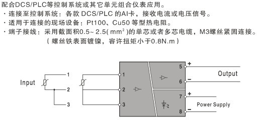 熱電阻信號(hào)輸入,經(jīng)過(guò)隔離, 轉(zhuǎn)換為固定量程的標(biāo)準(zhǔn)直流信號(hào)輸出。
