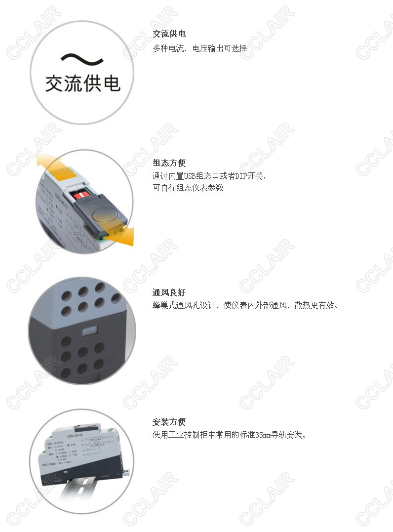 小巧的外殼結(jié)構(gòu),35mm標準導(dǎo)軌安裝方式,多種電流、電壓輸出可選擇。